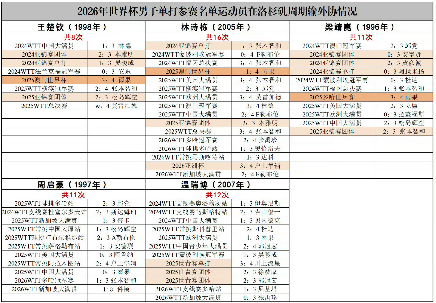 2026年WTT重庆冠军赛林诗栋已经确定退赛,今年21岁的林诗栋整个2026赛季状态都不佳,WTT新加坡大满贯止步八强,亚洲杯止步八强,WTT马斯喀特常规挑战赛止步八强,WTT多哈球星挑战赛止步16强,WTT多哈冠军赛止步四强。林诗栋自2025年2月8日后男单项目就没有夺过冠。